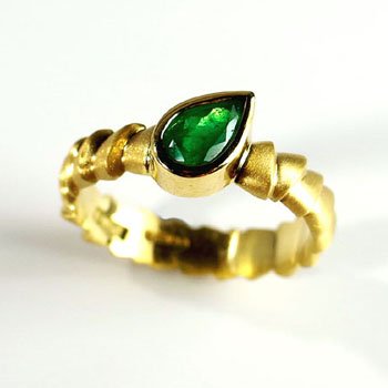 18ct yellow gold ring set with drop shaped emerald.